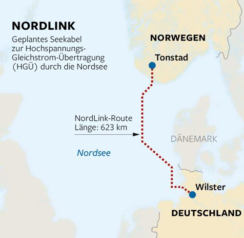 NordLink是首個銜接德國和挪威電網(wǎng)的互聯(lián)體系,被視為可再生動力交流的高度互補,由于德國的風(fēng)能和太陽能發(fā)電場以及挪威的水力發(fā)電廠能夠作為德國進(jìn)口動力的“動力庫”。